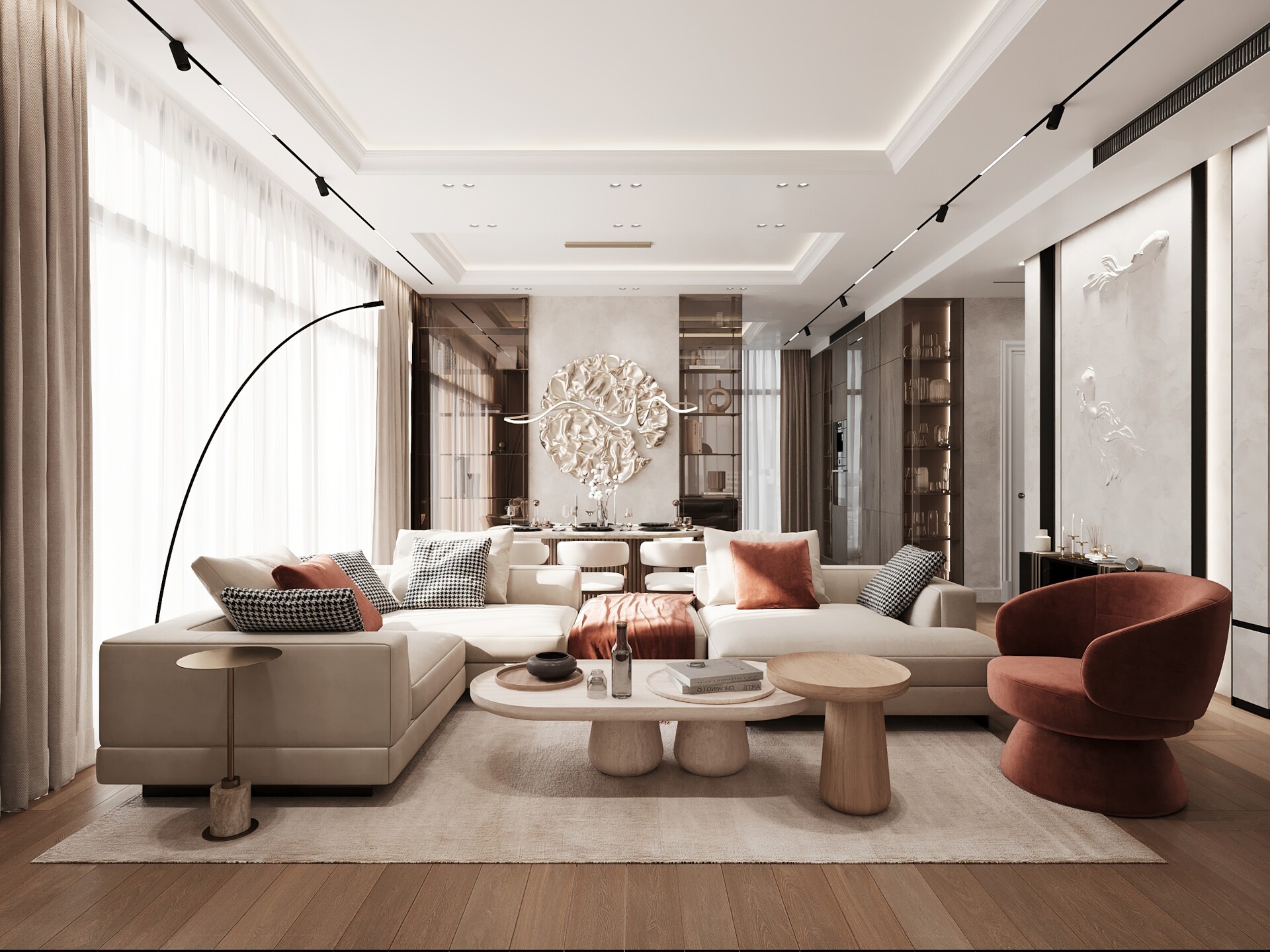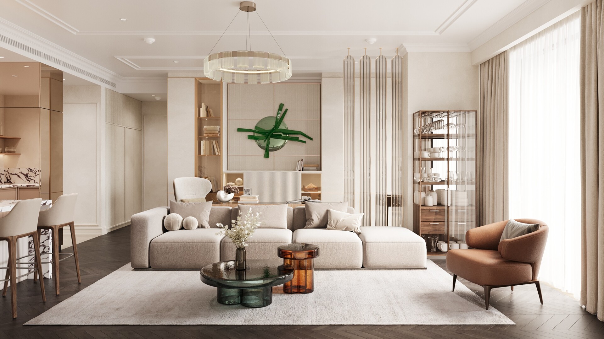 Проект разрабатывался для молодой пары, планирующей долгое совместное проживание в будущей квартире. В гостиной мы постарались совместить самые современные предметы дизайна с элементами неоклассики, такими как лепнина на потолке и симметричность встроенных стеллажей. Такое решение добавило уюта и раслабленности в светлый интерьер с одной стороны, сохранив общую строгость и изысканность стиля с другой. Медный, пришедший на смену наскучившему золотому, выгодно подчеркивает холодные оттенки, при этом не перегружая иньерьер. А сохранение стеллажа и стены за ним белыми как потолок помогло зрительно соединить эти плосоксти в единое целое, тем самым визуально расширив и вытянув пространство. Проект разрабатывался для молодой пары, планирующей долгое совместное проживание в будущей квартире.
